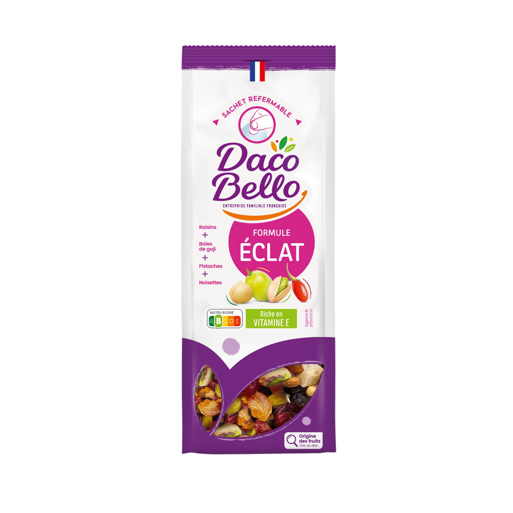 An explosion of sensations thanks to this formula rich in Vitamin E: fruity notes, play of textures with tender grapes and crunchy hazelnuts and unique taste of goji berries.Sultanas (raisins, cottonseed oil), roasted blanched hazelnuts , dried goji berries, roasted shelled pistachios . Information in bold is intended for people with intolerances or allergies. Possible traces of peanuts, almonds, walnuts, cashews, pecans, Brazil nuts, macadamia nuts, sesame seeds, wheat, rye, barley, oats, spelt, kamut, sulphites and soy.