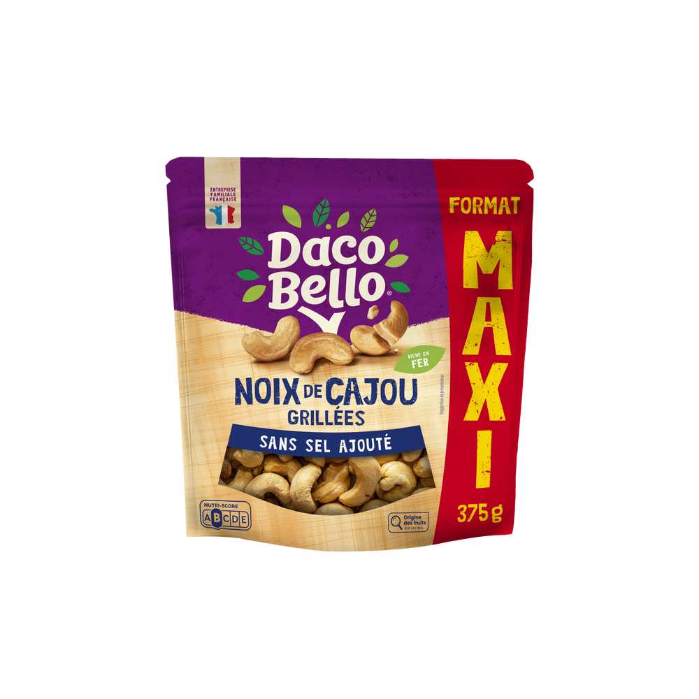 Our cashew nuts are carefully chosen for their generous size and their beautiful ivory color. They are delicately roasted without added salt or oil. The MAXI format's fresh zip will allow you to preserve your cashew nuts properly!