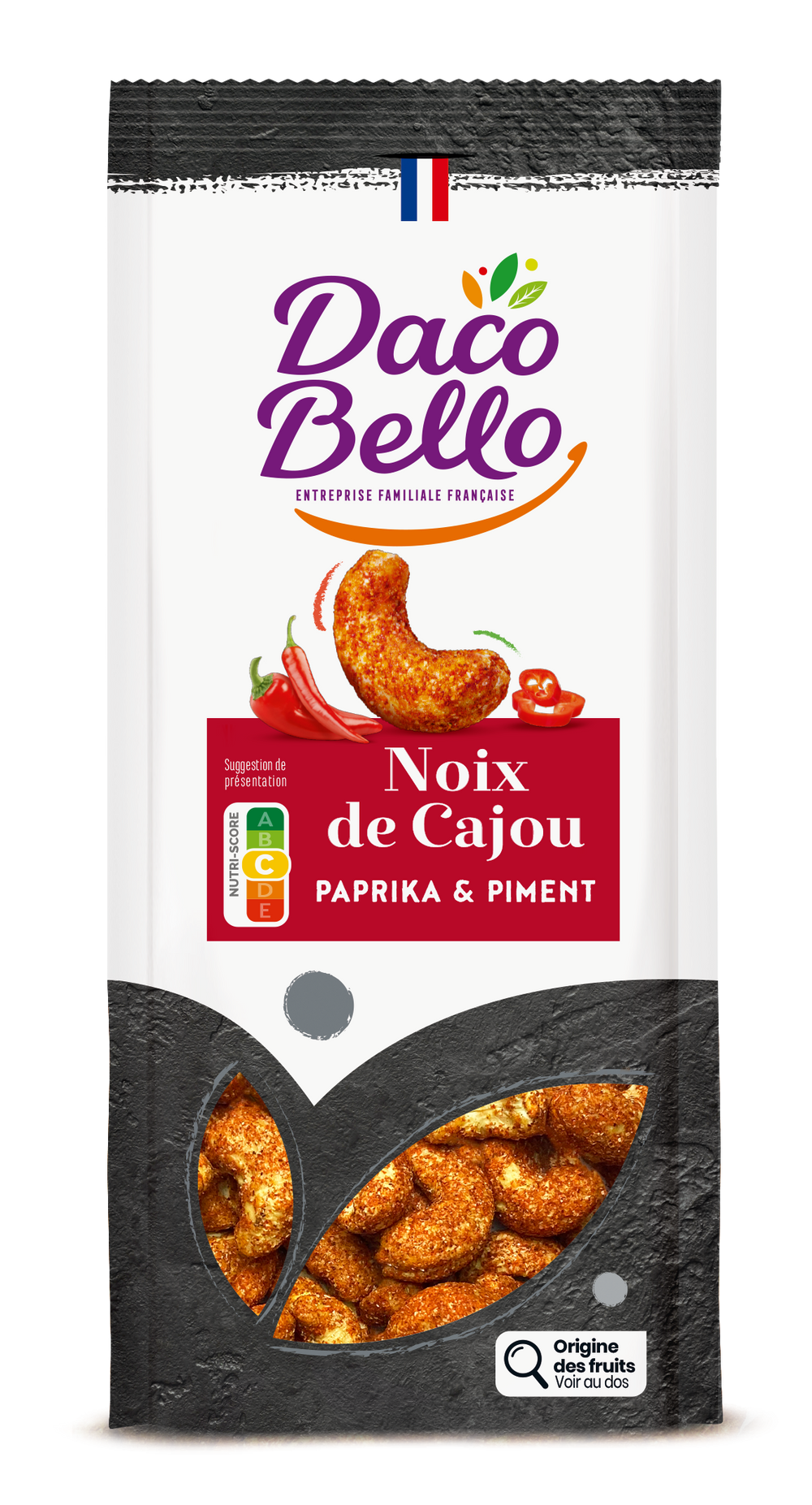 Noix de cajou grillées 91 %, paprika doux fumé 2,7 %, oignon semoule, ail déshydraté, piment chipotle 0,9 %, sel, arôme : huile essentielle de piment feuille, agent d’enrobage : gomme d’acacia.