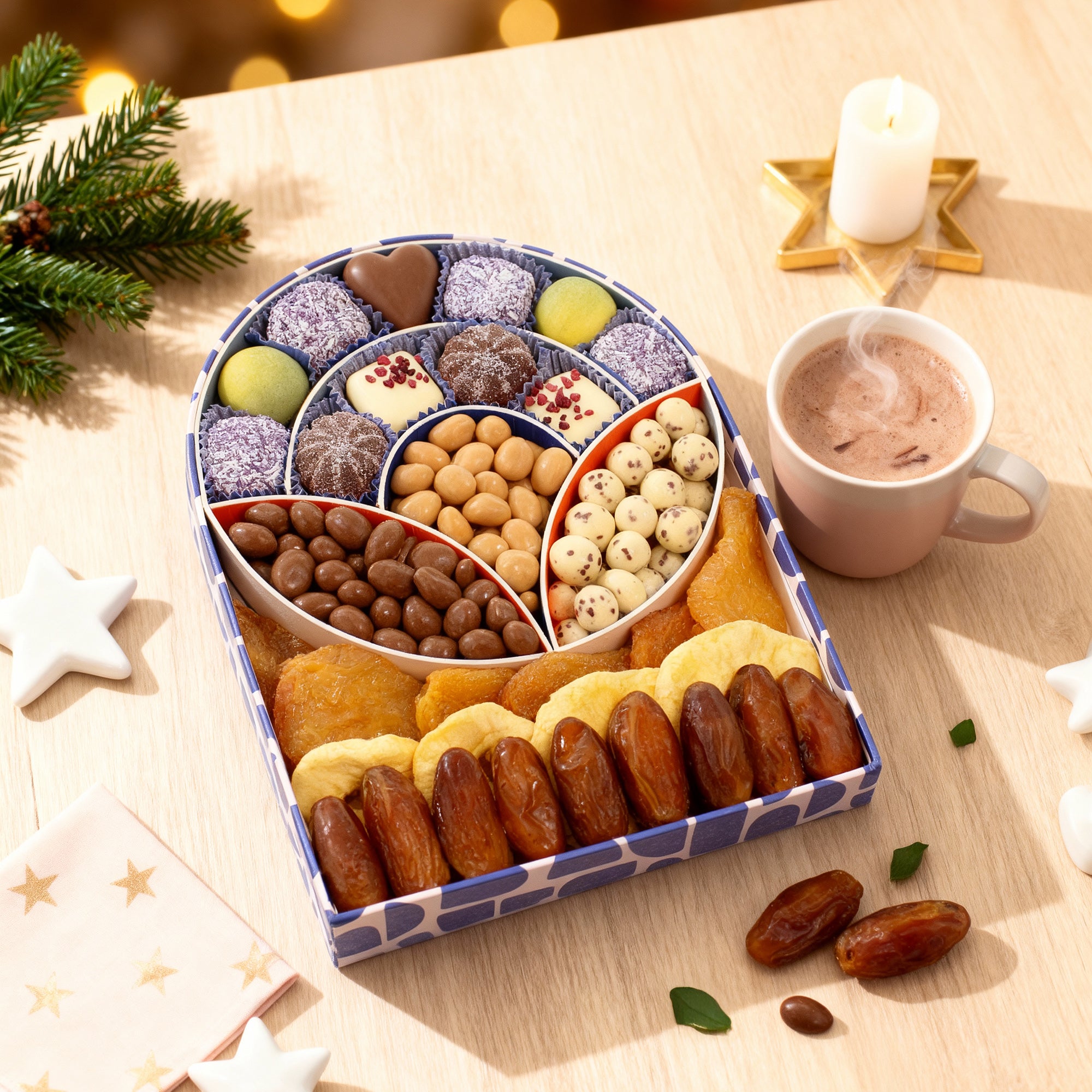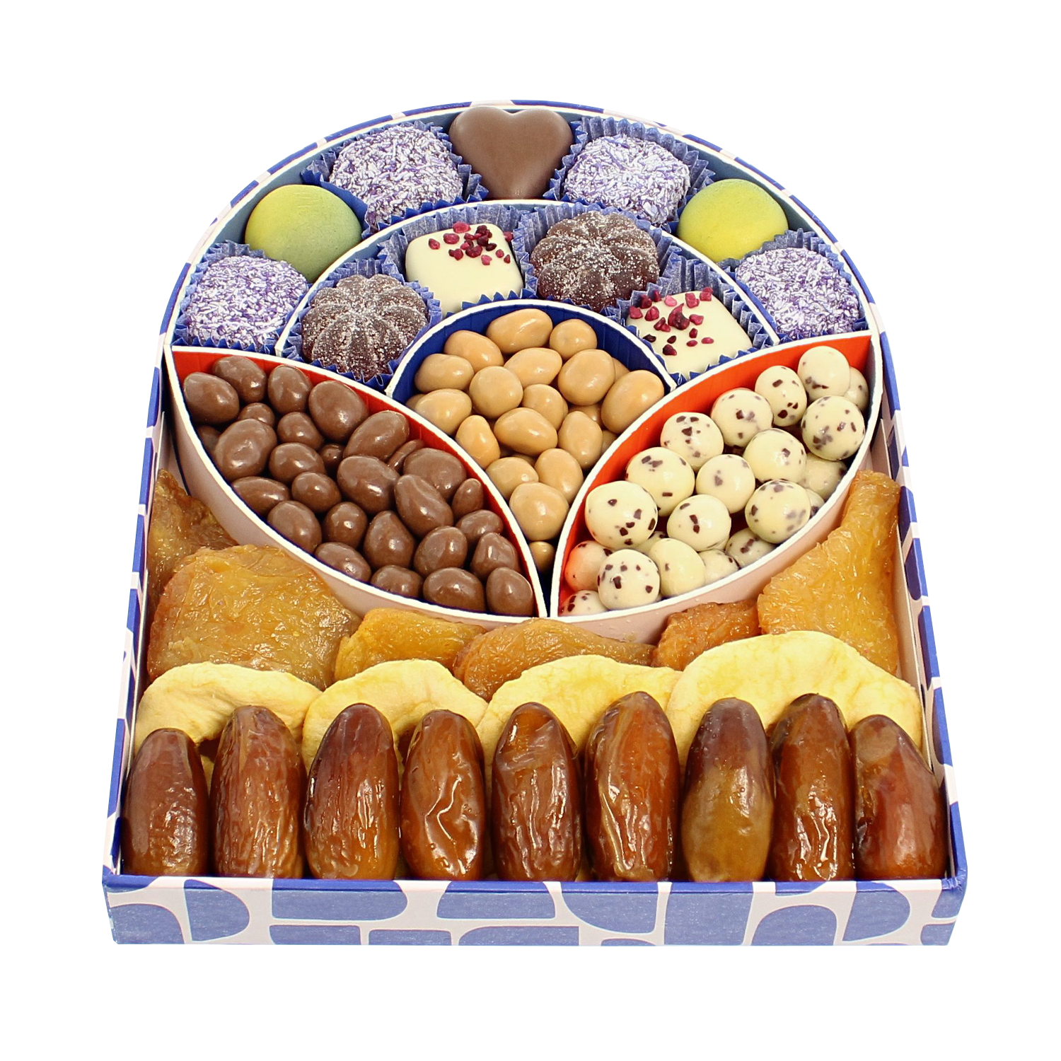 Cette corbeille est composée de dattes, de poires et pommes séchées, de loukoums coco-violette, de cacahuètes enrobées de chocolat, de pâtes de fruits, de boules de pâte d'amande, de billes de riz croustillantes, de carrés chocolat blanc framboise et de cœurs pralinés.