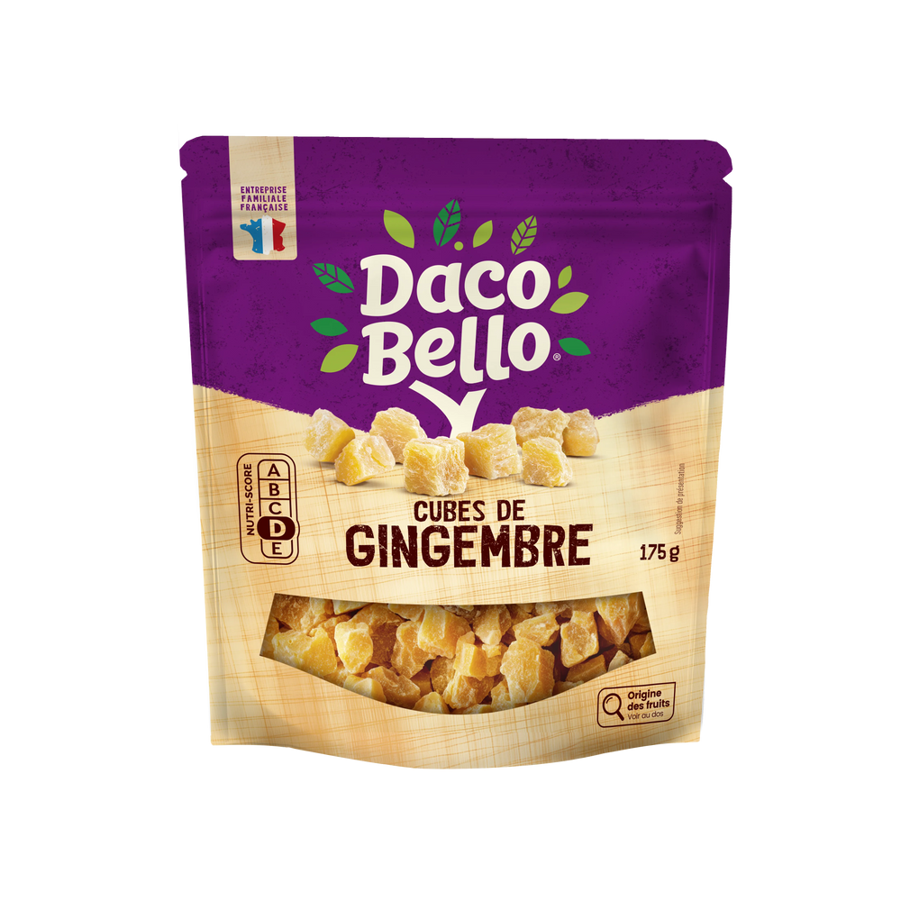 Cubes de gingembre séché au sucre de canne, pour une texture moelleuse et un goût relevé. À grignoter tels quels ou à intégrer dans vos préparations sucrées et salées.