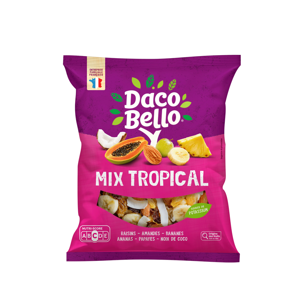 Raisins noirs 34.9% (raisins secs, huile de tournesol), amandes décortiquées 18.3%, chips de bananes 16,3% (bananes, huile de coco, sucre, arôme naturel), cubes d'ananas 13.1% (ananas séchés, sucre, acidifiant : E330, conservateur : anhydride sulfureux), cubes de papaye 13.1% (papayes séchées, sucre, conservateur : anhydride sulfureux), noix de coco séchée 4.3%.